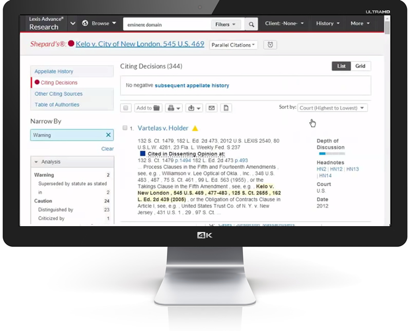 I have worked on various projects for Lexis Advance over the years, including Shepard’s, (shown here), all of the content (meaning the display of each content type in the results and the display of the documents themselves (right panel area), annotations for documents in work folders, and a citation convertor that not only adds the citation when the user copies text, but is able to apply the correct format for a variety of jurisdictional style manuals. I was responsible for bringing the Shepard’s® Report into compliance with the 2014 redesign, which was challenging because it had some unique features which required some brainstorming to conform to the new design patterns.