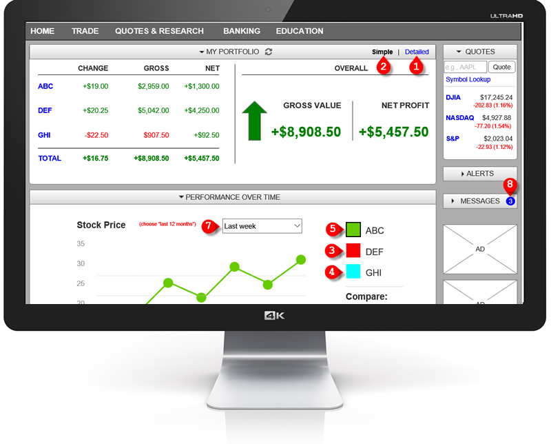 The consumer-facing dashboard of my online trading platform is completely cluttered and clunky with virtually unusable information. I always like to have an overall view of how my stocks are doing today as well as as compared to my original purchase price, but to get that, I had to memorize a series of nonintuitive steps. I decided to undertake to simplify it with the most important information prominently displayed. It includes an interactive graph where the user can view the performance of each stock separately, or compare a stock with various indices, such as the Dow. It also has collapsible pods, which I will eventually made draggable. This was created for my portfolio.